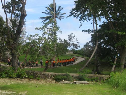 I was impressed by the pragmatic way both staff and children responded to this unexpected event. I say unexpected, but I guess rain is never totally unexpected in the Caribbean. Large umbrellas materialised from somewhere, and some of the older girls who were sitting at the back with me used them to ward off the first sprinklings. They gave up however when the umbrellas became ineffective against the torrent. Those of us on the edges had to move to the centre. The speakers were hastily covered, and the PA system moved to safety.