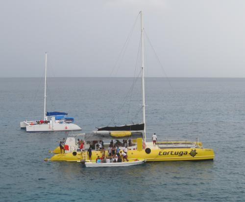 Unfortunately it was a rainy day so there was no spectacular sunset, but there were plenty of American tourist. Many came in on the pleasure catamarans that pulled up right into the cove; others came by bus and taxi.